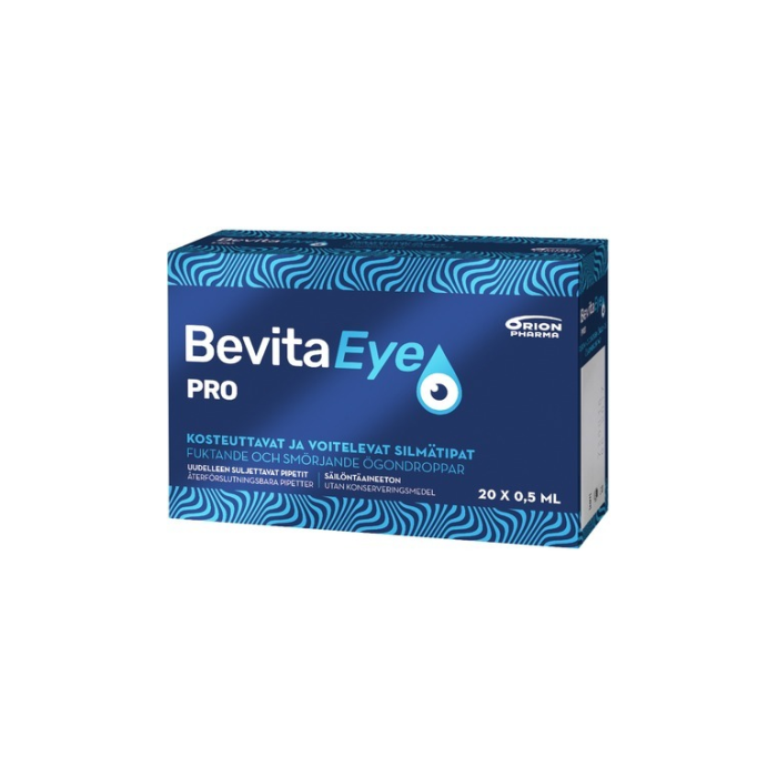 Bevita Eye Pro on säilöntäaineeton silmätippaliuos, joka soveltuu keskivaikean ja vaikean kuivasilmäisyyden hoitoon. Se kosteuttaa, suojaa, voitelee ja tasapainottaa. Valmiste soveltuu tutkitusti erityisen hyvin käytettäväksi piilolinssien kanssa. Oireita helpottava vaikutus on tutkitusti pitkäkestoinen. Patentoitu koostumus on myös säilöntäaineeton ja fosfaatiton.