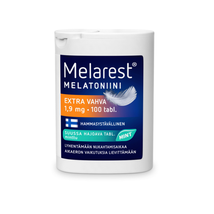 Melarest melatoninpreparat för att förkorta insomningstiden, lindra effekterna av tidszonsskillnader. Melarest Melatonin Extra Stark -tuggtabletter innehåller 1,9 mg melatonin. De välsmakande, tandvänliga, smältande tabletterna är lätta att ta utan vatten. Produkten passar både för sporadisk användning och för längre tids användning. Melatonin hjälper till att förkorta insomningstiden och hjälper också till att lindra de individuella effekterna av tidszonsskillnader.
