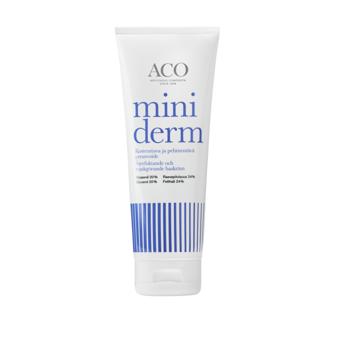 Miniderm on hellävarainen perusvoide, joka pehmentää, hoitaa ja kosteuttaa kuivaa ihoa. Sisältää 20 % glyserolia, joka sitoo kosteutta tehokkaasti ihoon. Miellyttävä käyttää, levittyy helposti ja imeytyy nopeasti. Hajusteeton. - Kuivalle ja herkälle iholle - Vauvoille, lapsille ja aikuisille - Rasvapitoisuus 24 %