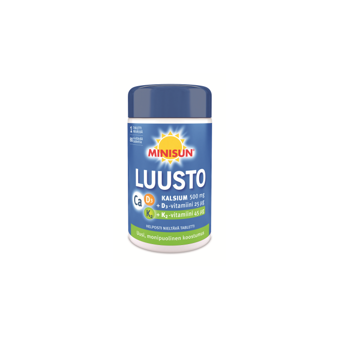 Minisun Kalsium +D₃ + K₂ sisältää kalsiumia sekä D₃- ja K₂-vitamiinia. Minisun Kalsium +D₃ + K₂-vitamiini on enemmän kuin kalsium: se sisältää luuston hyvinvoinnin kannalta kaksi elintärkeää vitamiinia sekä kivennäisaineen yhdessä tabletissa. Jokaisella ainesosalla on oma roolinsa luuston terveyden ylläpidossa. D-vitamiini, kalsium ja K₂-vitamiini varmistavat yhdessä luuston hyvinvoinnin. K₂-vitamiini sitoo kalsiumin elimistössä oikeaan paikkaan eli luustoon. Lisäksi D-vitamiini vahvistaa vastustuskykyä ja on tärkeä vitamiini lihasten ja hampaiden hyvinvointiin. Yksi nieltävä tabletti päivässä riittää! Valmiste ei sisällä ei sisällä gluteenipitoisen viljan ainesosia, ja on lisäksi laktoositon, maidoton, liivatteeton, soijaton sekä hiivaton.