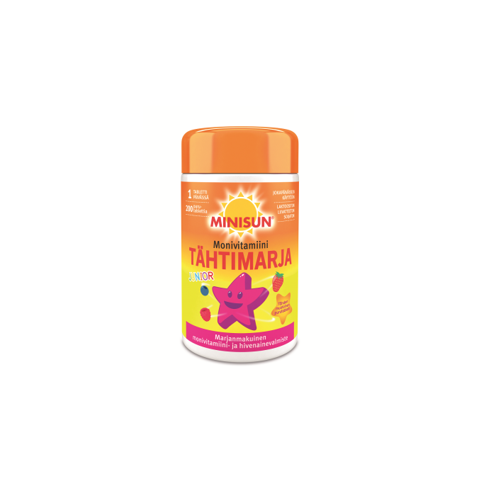 Minisun Multivitamin Junior Tähtimarja är stjärnformad mångvitamin designad för finska barn. Den innehåller bl.a. D- och C-vitamin och zink. Minisun Multivitamin Junior Tähtimarja är en stjärnformad tuggtablett som smakar bekvämt bärig.