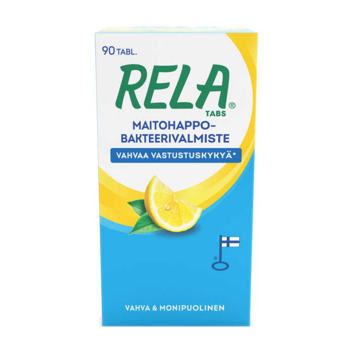 De förnyade Rela-mjölksyrebakterieprodukterna innehåller två undersökta och högklassiga bakteriestammar (Lactobacillus rhamnosus SP1 och Bifidobacterium lactis BLC1) och hela 3 miljarder bakterier per daglig dos. För en stark motståndskraft** - utöver mjölksyrebakterier innehåller Rela Tabs-produkterna vitamin C, som är viktigt för upprätthållandet av kroppens motståndskraft. Rela Tabs Citron har en mild citronsmak, innehåller inte sukralos, och lämpar sig för hela familjen. De förnyade Rela-produkterna tillverkas i Finland och är försedda med nyckelflaggan.